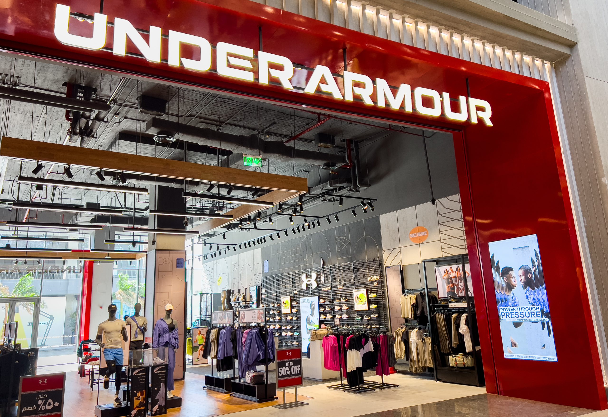 In District 5, SHAWER executed another Under Armour branch featuring glass-mounted logos and advanced LED installations. The signage layout emphasizes clarity and consistency while reinforcing the brand’s premium look. The interplay of textures and lighting ensures a refined shopping experience aligned with Under Armour’s international standards.